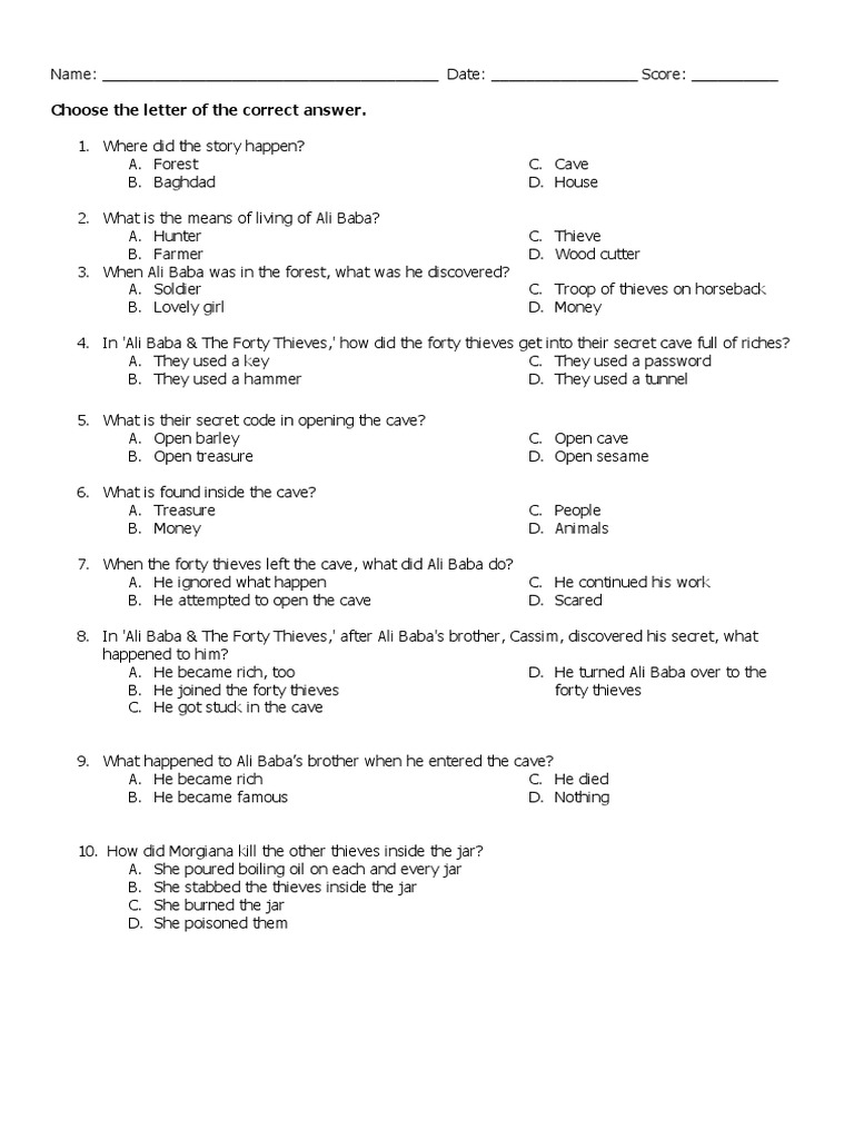 Ali Baba The 40 Thieves Quiz Worksheet For Kids Study Com